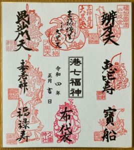 15,000 pas dans Minato-ku… pour faire connaissance avec les Sept dieux du Bonheur : Ebisu (Dieu de l’abondance, protecteur du travail, de la santé) dans le sanctuaire KUMANO, DAIKOKU-TEN (Dieu de la fortune) au temple DAIHO, BENZAI-TEN (Déesse de la Beauté, de la musique, de l’éloquence, de la littérature et des arts) dans le temple HOJU-IN, BISHAMON-TEN (Symbole de dignité, dieu des richesses) dans le sanctuaire HIKAWA, FUKUROKUJU (Dieu de la sagesse) dans le sanctuaire TENSO, JUROJIN (Dieu de la longévité) dans le sanctuaire SAKURADA, Hotei (Dieu du bonheur) dans le sanctuaire HISAKUNI.